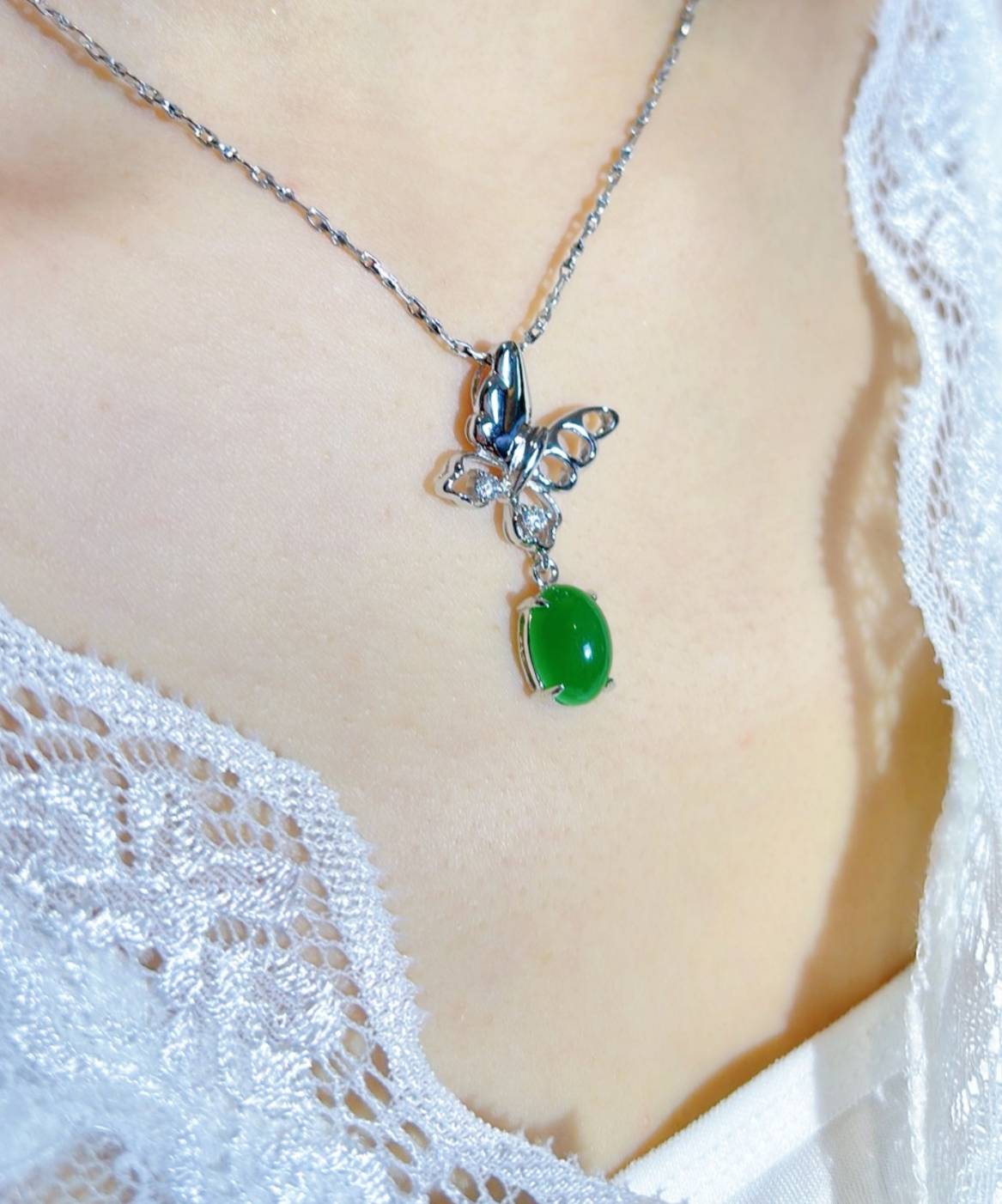 This necklace beautifully combines natural vitality with the soothing warmth of jadeite. The pendant is crowned by an exquisite butterfly motif, its wings gracefully detailed with sparkling small gemstones, conveying a sense of airy movement. Dangle below the butterfly is a smooth, full oval jadeite cabochon, displaying a rich emerald-green color and a fine, warm texture that radiates vitality. The jadeite's gentle glow and the butterfly's grace complement each other perfectly. Paired with a delicate chain, this jewelry piece highlights the wearer's fresh, refined elegance and appreciation for delicate beauty.