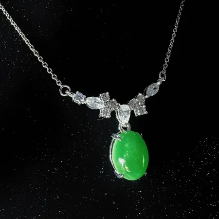This necklace exudes an aura of light luxury and elegance. The main feature is a smooth, full oval jadeite stone, displaying a captivating, rich emerald-green color with a fine, lustrous finish. The bail area, connecting the stone to the chain, is exquisitely designed in a graceful floral or leaf motif, set with several brilliant gemstones. These gems sparkle like morning dew, forming a delicate curve above the jadeite. The overall design is simple yet sophisticated, smoothly blending the classic warmth of jadeite with the contemporary brilliance of the accent stones. This piece beautifully frames the neckline, highlighting the wearer's femininity and grace.