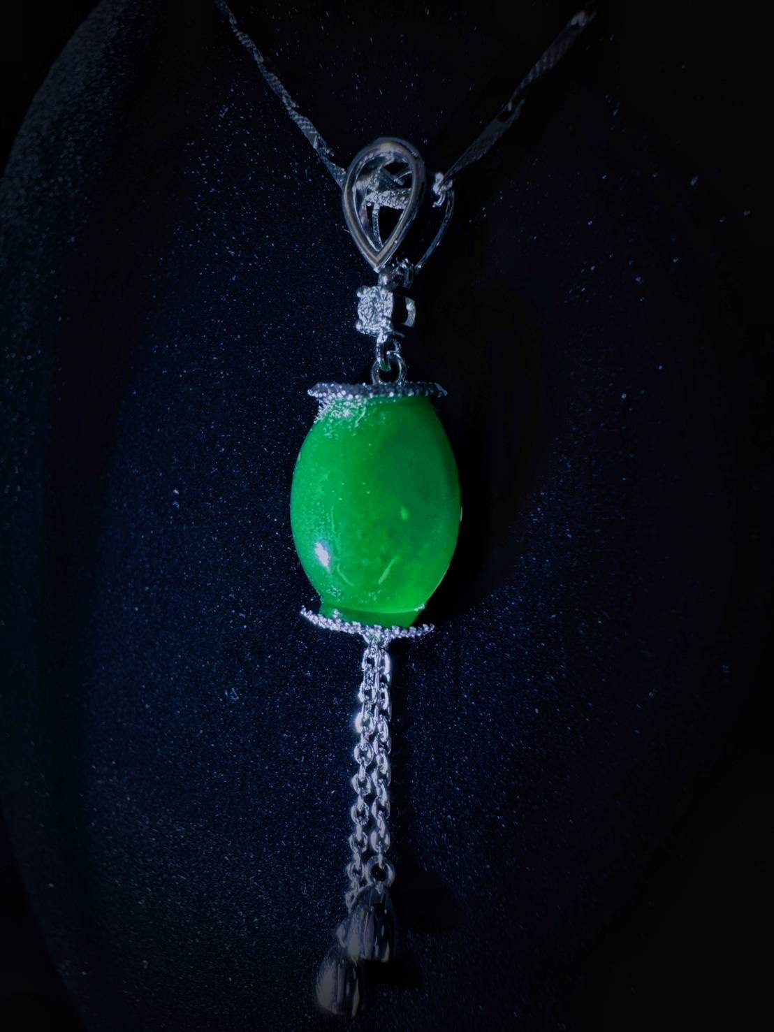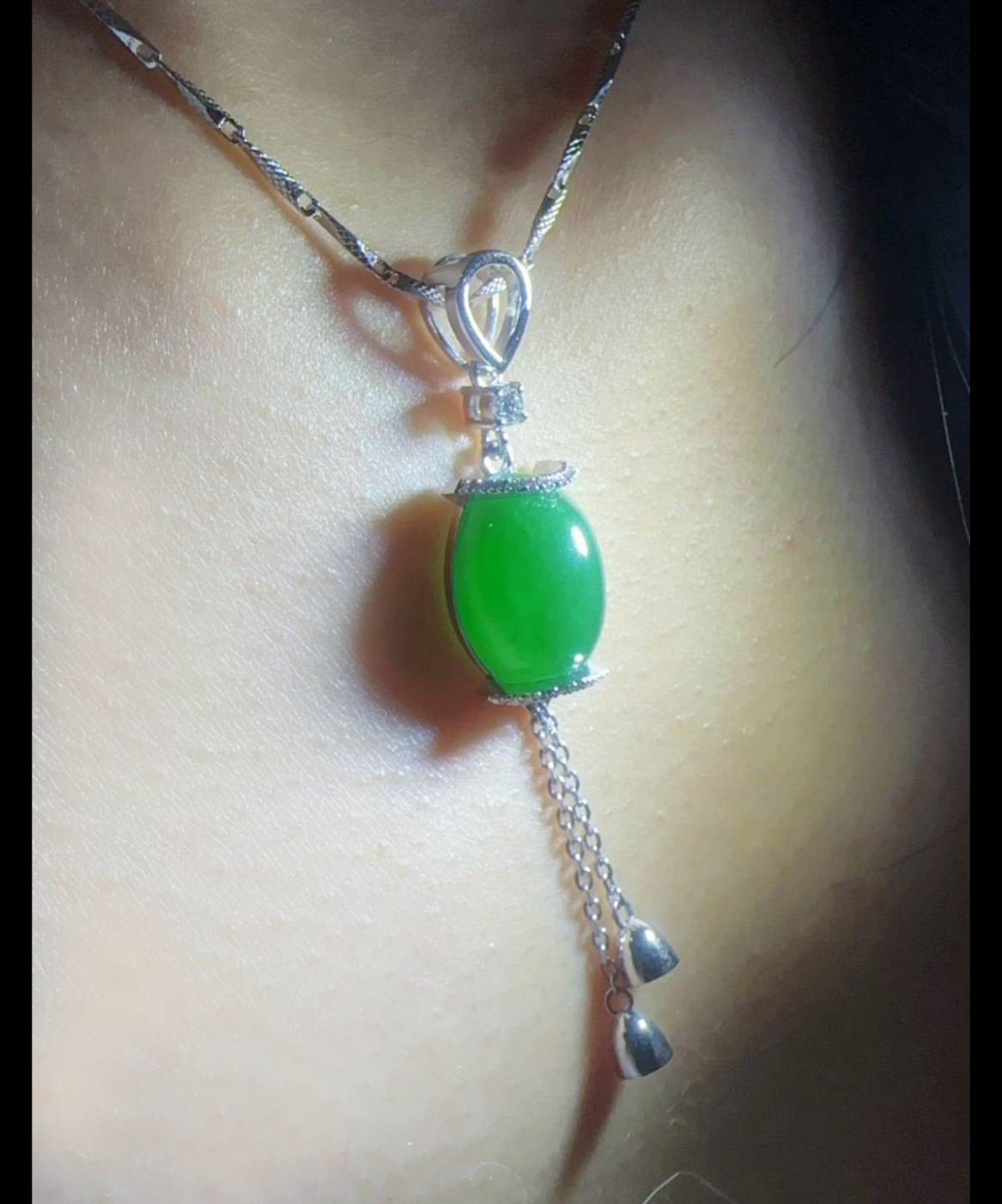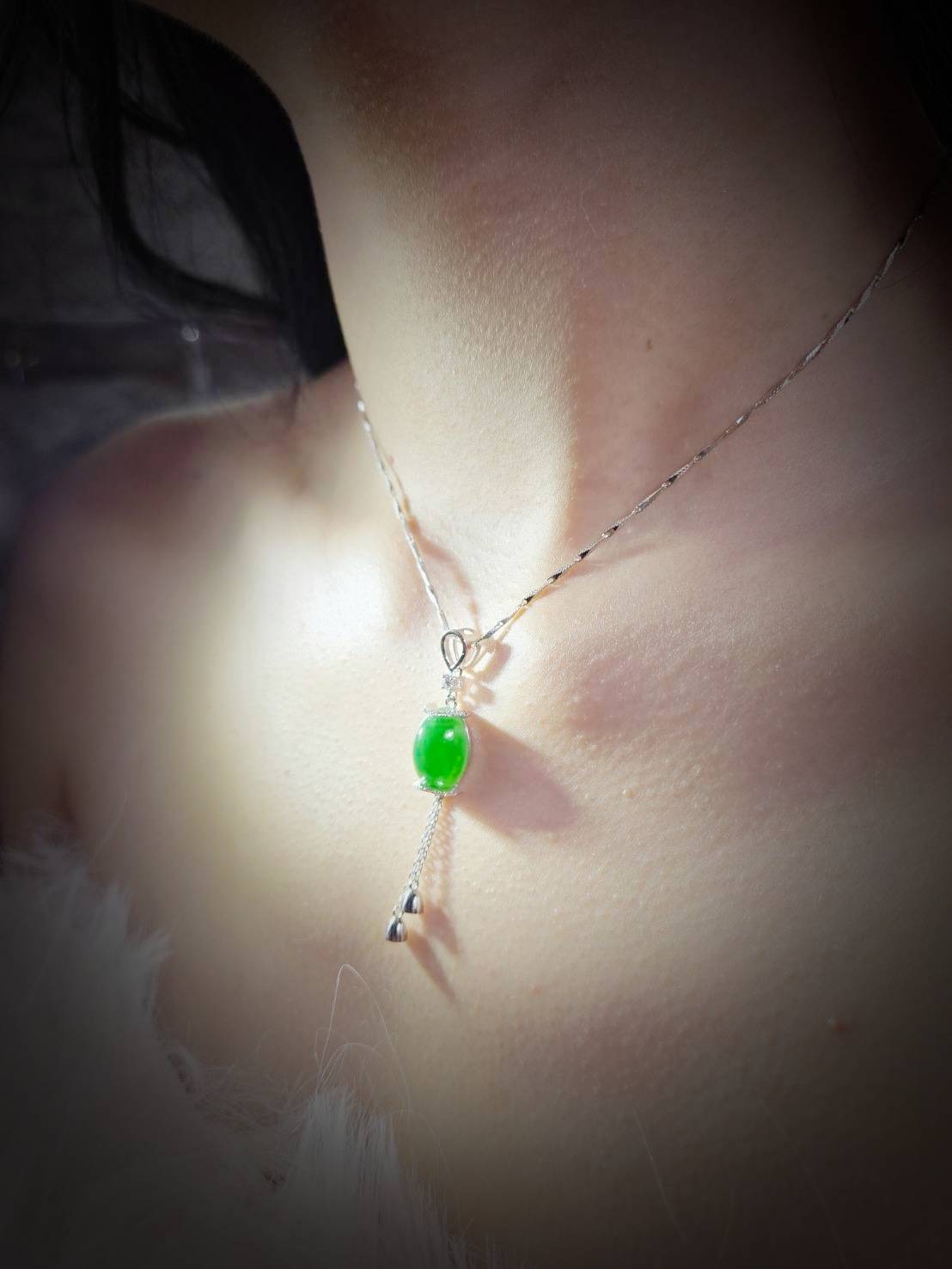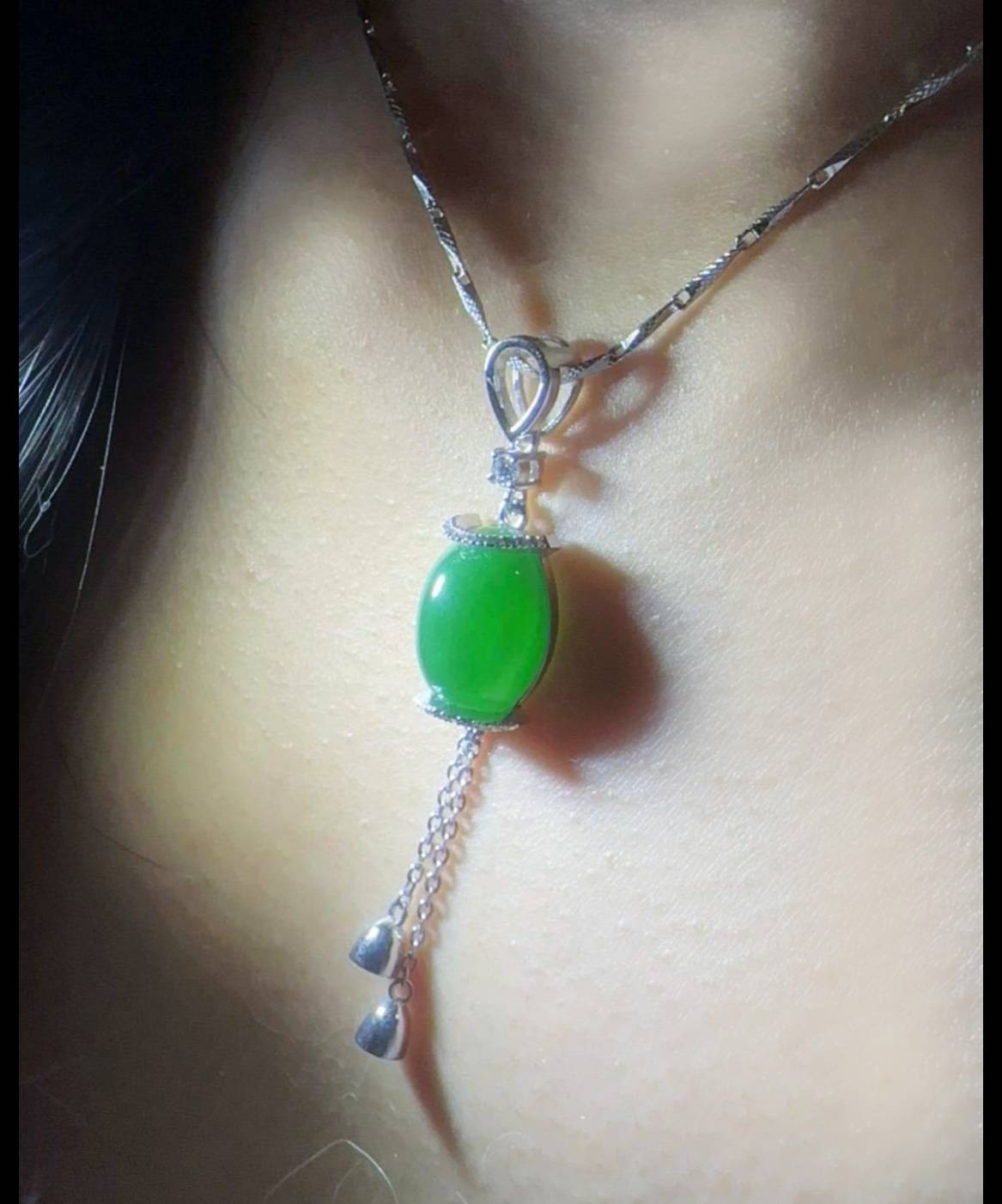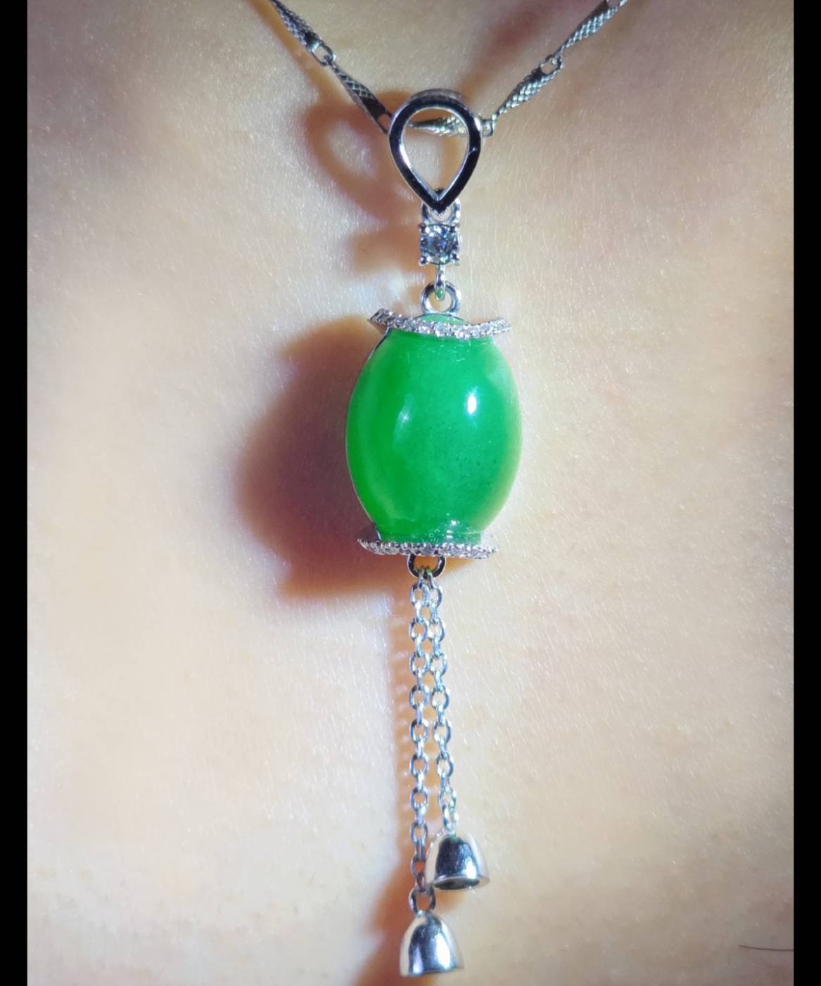 This necklace features an exquisite and unique design with a distinct Eastern flair. The centerpiece is a smooth, full barrel-shaped jadeite stone, exhibiting a rich, pure emerald-green color and a warm luster, symbolizing wealth and completeness. The jadeite is framed at both ends by elegant metal bands set with brilliant small gemstones, resembling the edges of a sophisticated lantern. Dangle below are two delicate silver chains finished with small bell accents, adding a playful sense of movement. This jewelry piece successfully blends classical symbolism with modern aesthetics, highlighting the wearer's noble yet charming demeanor.