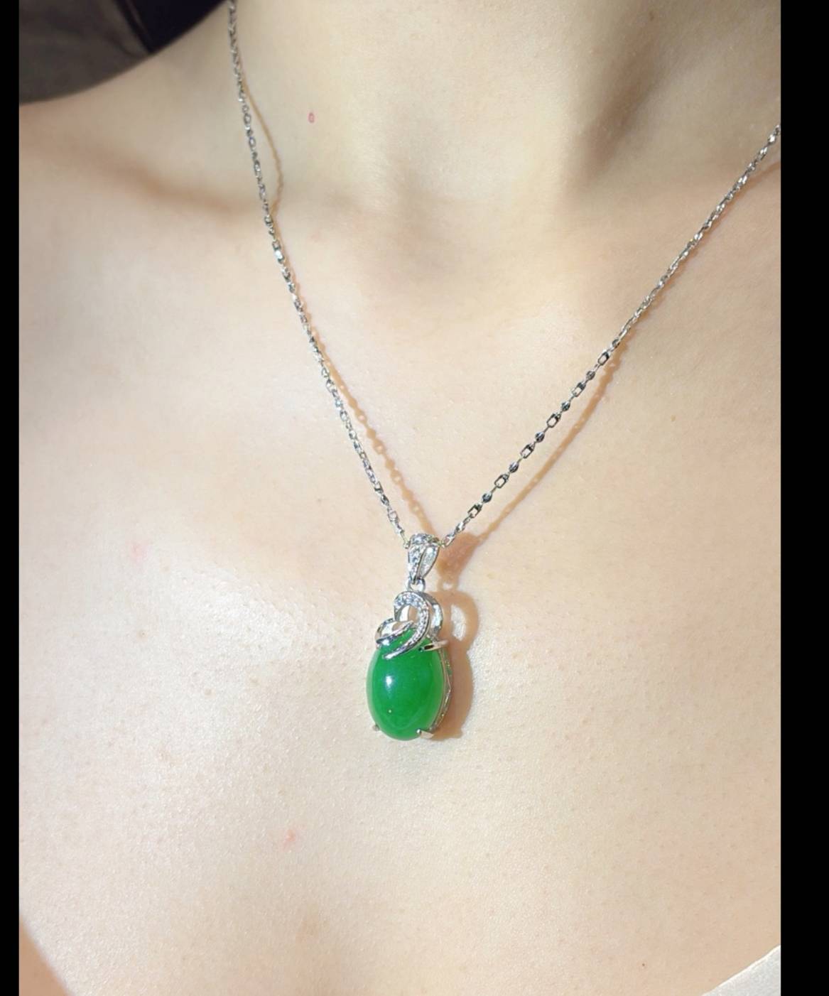 This graceful necklace features a polished green jadeite as its centerpiece, glowing with a radiant translucence. The pendant’s flowing design is adorned with delicate silver curves that embrace the jadeite like a refined ribbon, adding a touch of romance. The vivid green hue harmonizes with the refined metallic shine, creating an aura of timeless elegance. Worn close to the neckline, it exudes subtle sophistication, enhancing the wearer’s beauty with both grace and confidence.