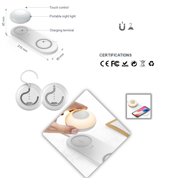 Night Light Portable (Detachable) Ultra soft visual (18 lumens) Dimmable (2 - 18 lumens) Ball joint hook Magnetic mount Charging Pad 10W fast charge for smart phone Qualcomm Quick Charge 3.0 Compatible (Apple & Android - 7.5W / 10W) iPhone X, XS & Max, XR, 8+ & 8, AirPods 2 Samsung Galaxy - S10 & 10+, S9 & 9+, S8 & 8+, S7 & edge, S6 & edge Huawei - P30 Pro, Mate 20 RS & Pro, Mate Rs