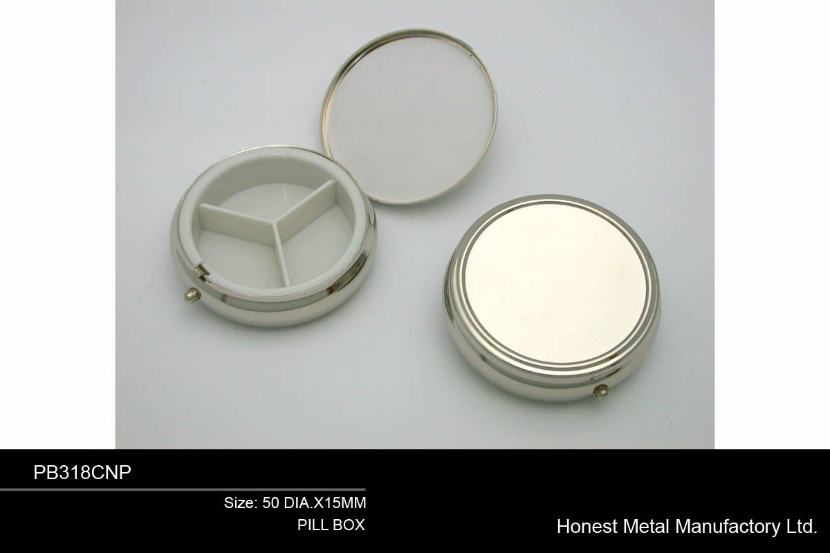 • Iron pill box, push button opening, concave on top.