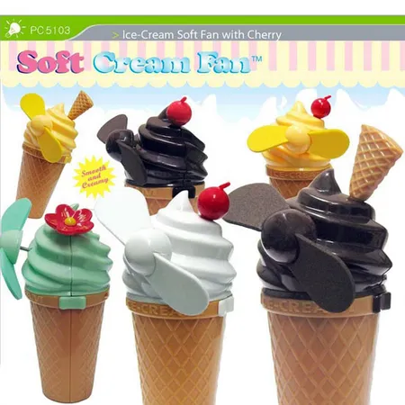 This mini fan comes with an ice-cream design for an eye-catching look. It is designed with soft EVA blades for reliable performance. This soft cream fan is finished with a cherry ornament for a touch of style.