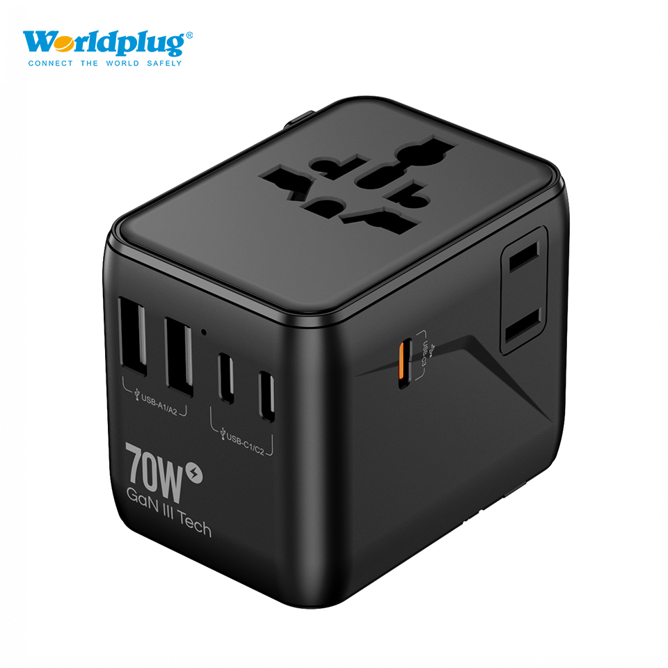 PD 70W fast charging universal travel adapter with 2 USB-A and 3 Type C ports. Can charge laptop