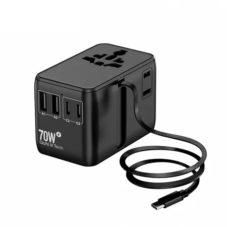 PD 70W fast charging universal travel adapter with 2 USB-A and 3 Type C ports.