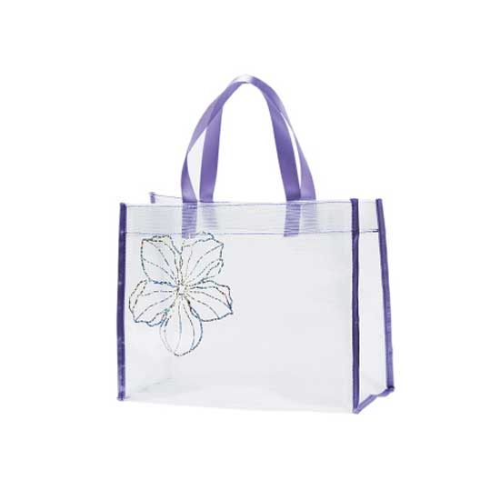 The woven shopping bag showcases a transparent design, giving you a quick glimpse of the contents within. The convenient handles let you carry the bag easily on your shoulder. The beautifully crafted floral pattern in the front adds a touch of femininity to the whole piece. This well-designed shopping bag is an eco-friendly choice for today's environment-conscious generation.