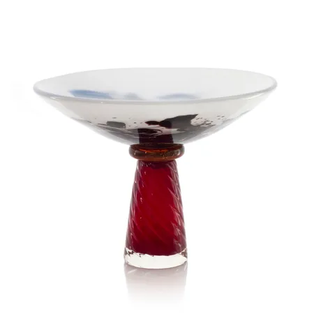 In this stunning centerpiece, a milky dish is elevated on an elegant twisted base. The outside of the bowl features expressive swirls of inky black, like brushstrokes on white rice paper, capturing the emotion of the artist. Shadows of the pattern are visible from the inside of the bowl.