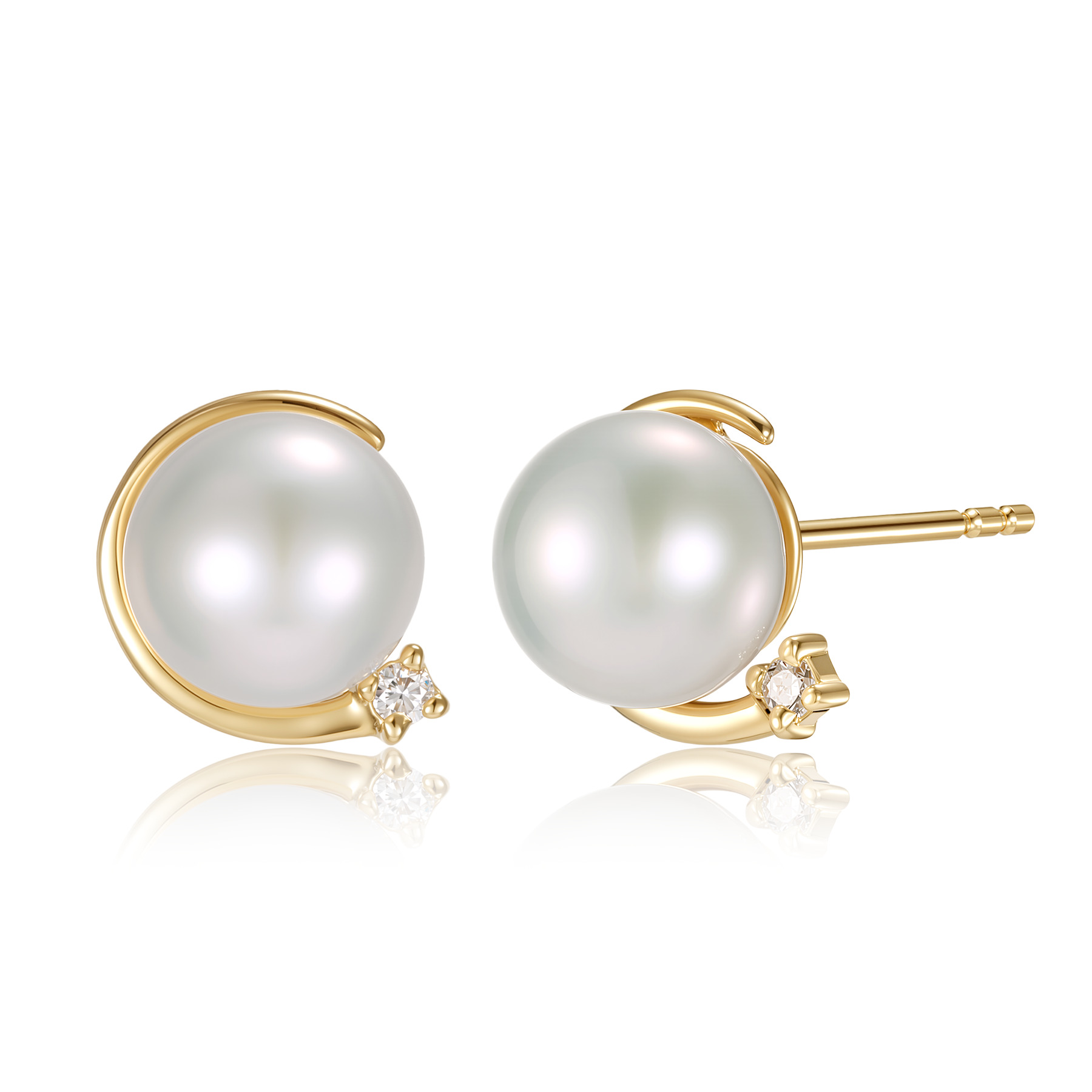 14K YELLOW GOLD EARRINGS WITH 7-7.5MM WHITE ROUND FRESHWATER PEARL AND DIAMONDS (WITH GOLD BUTTERFLY)