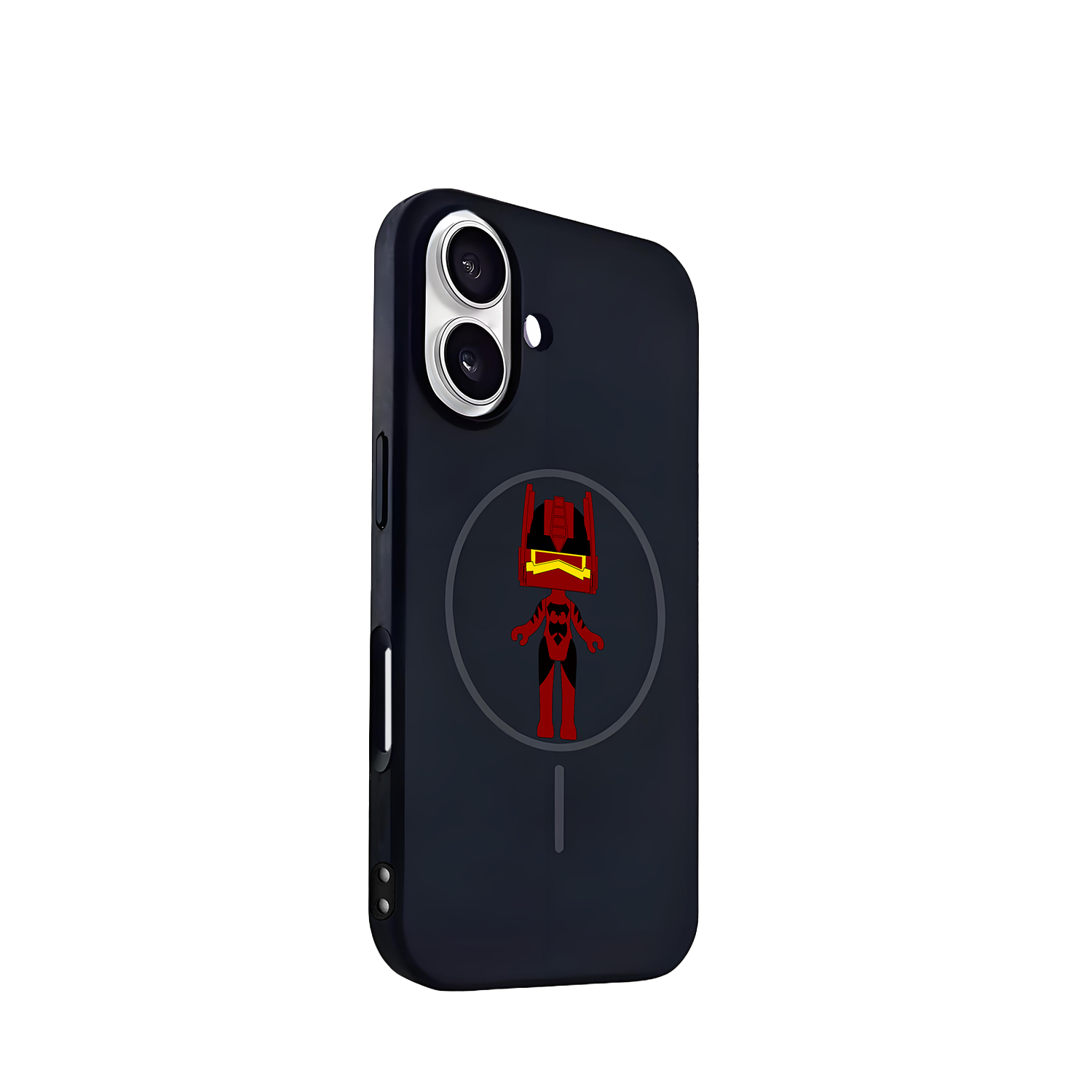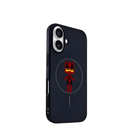 Make a bold statement with this striking MIDNIGHT BLACK iPhone case featuring Blaze from HelmeTeam. The case showcases a sleek MIDNIGHT BLACK base adorned with an animated robot figure in red and black accents. The dual-camera cutout is beautifully framed with a premium MIDNIGHT BLACK finish that adds a touch of sophistication. This protective case maintains a slim profile while offering reliable protection for your device. The modern geometric patterns and futuristic design elements create an eye-catching aesthetic that's perfect for tech enthusiasts and style-conscious users alike. The precise cutouts ensure easy access to all buttons and ports, while the durable construction helps shield your phone from everyday bumps and scratches. The clean MIDNIGHT BLACK background and minimalist design approach make this case a versatile accessory that pairs well with any style.