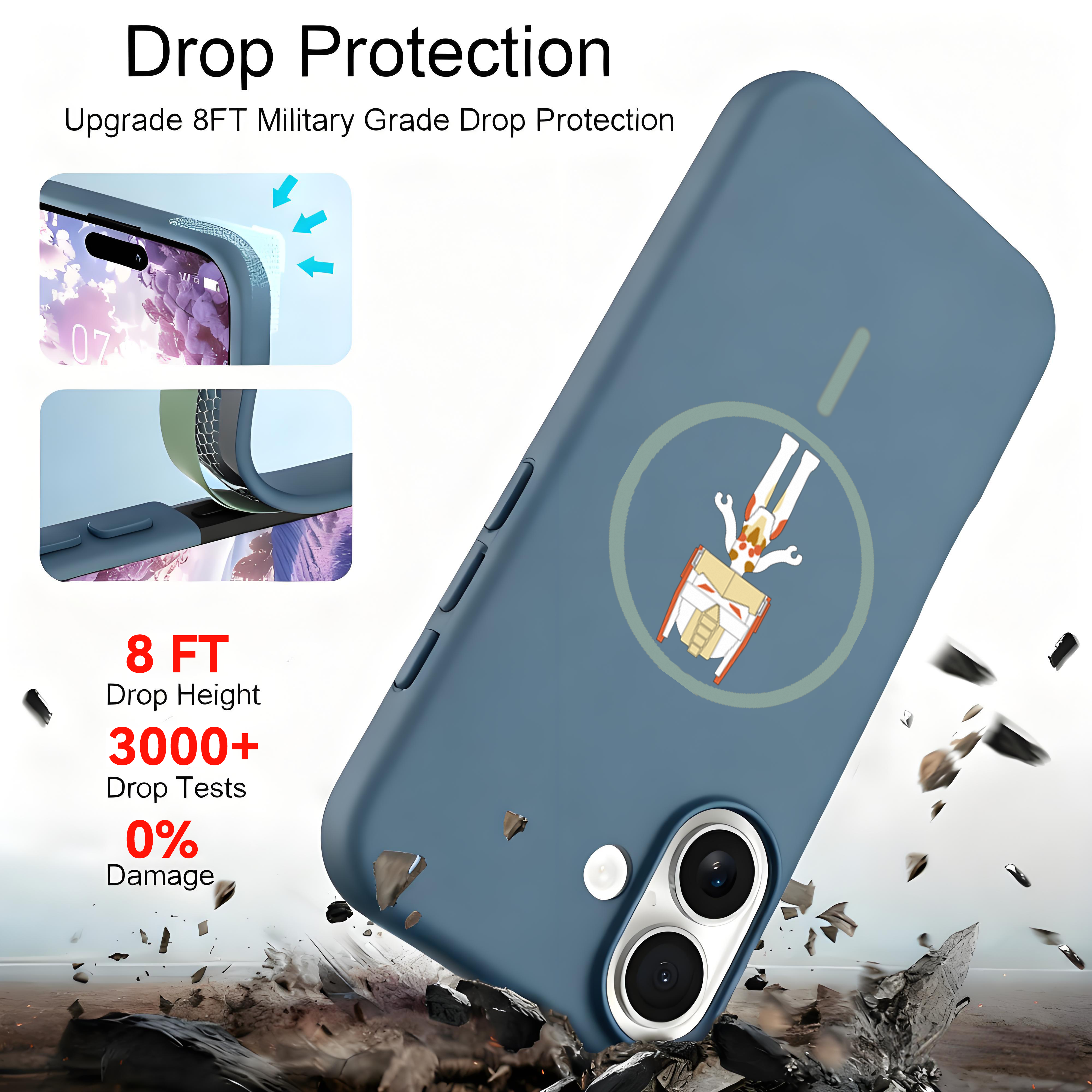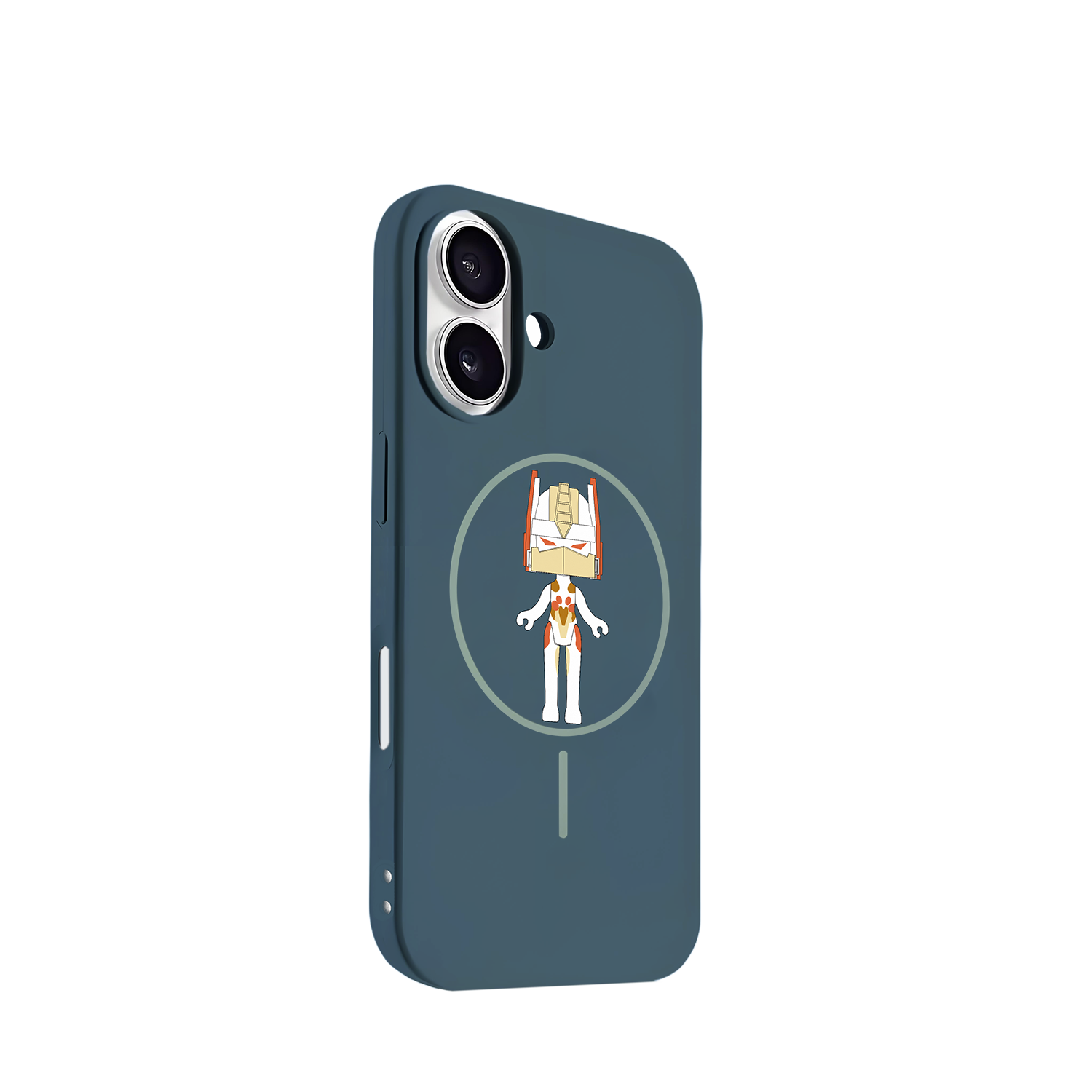 Make a bold statement with this striking SAPPHIRE BLUE iPhone case featuring Frost from HelmeTeam. The case showcases a sleek SAPPHIRE BLUE base adorned with an animated robot figure in white, gold, and orange accents. The dual-camera cutout is beautifully framed with a premium SPPAHIRE BLUE finish that adds a touch of sophistication. This protective case maintains a slim profile while offering reliable protection for your device. The modern geometric patterns and futuristic design elements create an eye-catching aesthetic that's perfect for tech enthusiasts and style-conscious users alike. The precise cutouts ensure easy access to all buttons and ports, while the durable construction helps shield your phone from everyday bumps and scratches. The clean white background and minimalist design approach make this case a versatile accessory that pairs well with any style.