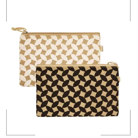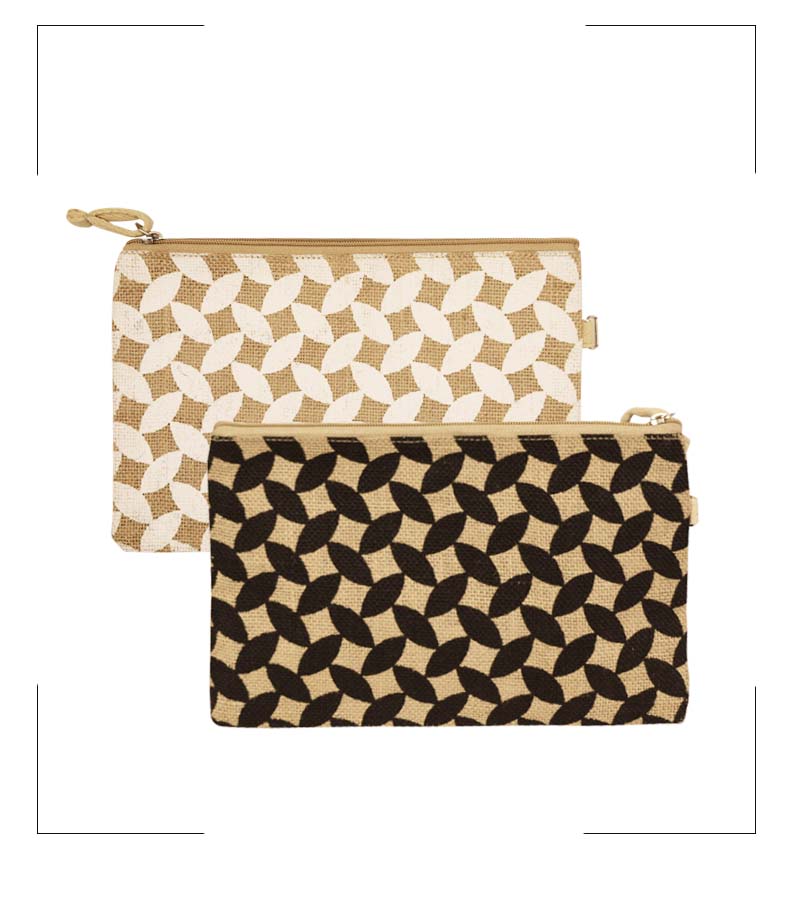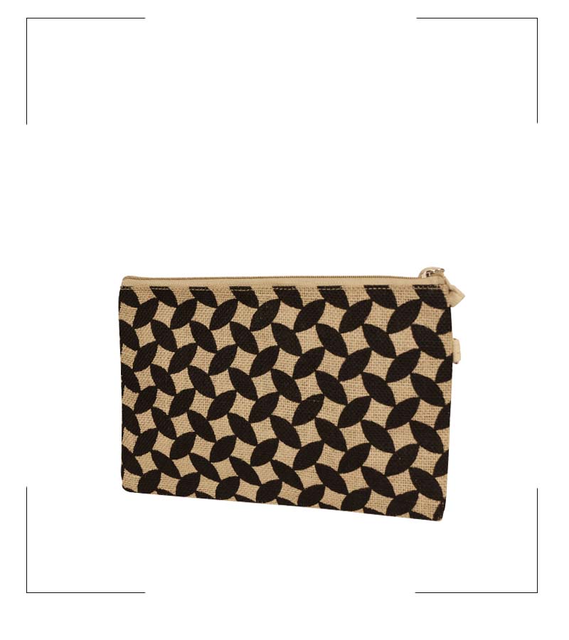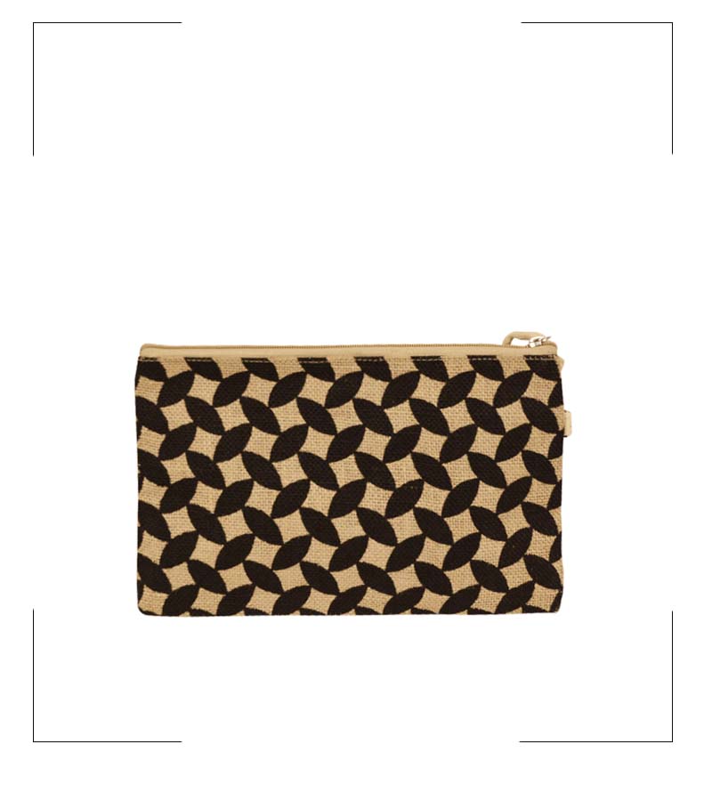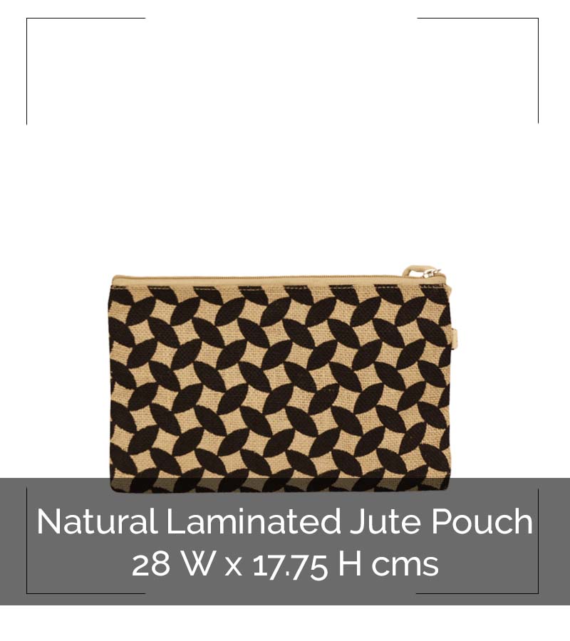 Natural Laminated Jute Pouch with Leaf Printing and Zipper Closure with Tassel.