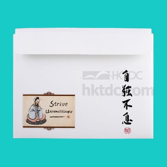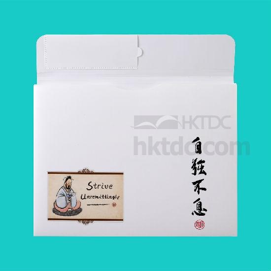 The ancient China culture theme in eye catching cool white background make the product super unique in market. The shell is made in thick PP which allow strong protection to documents. The slim design provoke user desire to bring it to attend a short noticed meeting. The pen pocket underneath the flap allows user to fetch their writing instructment handily.