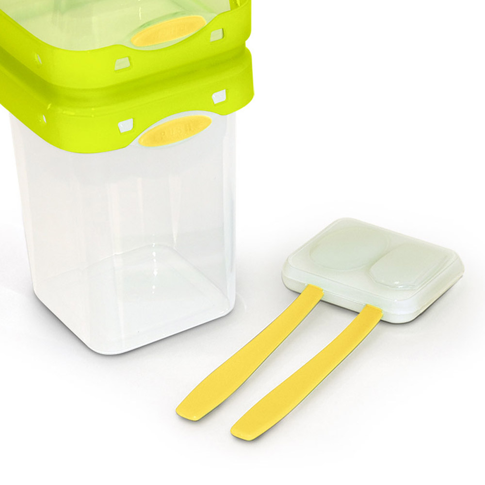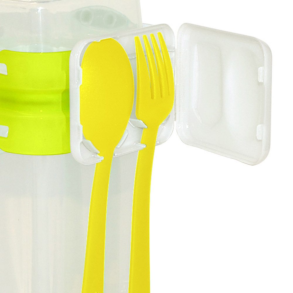 Featured here is a set of two food containers in interlocking design. The food containers have capacities of 400ml and 650ml respectively and come with a lid in the middle for covering. They provide secure spill-proof storage for food and come with a set of cutleries for added convenience.