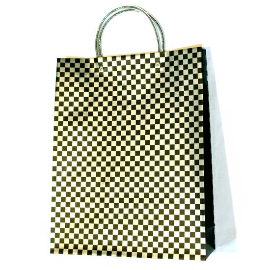 The PP shopping bag highlights fashionable checkered patterns. The plastic tube handle allows sturdy carrying. This durable and reusable shopping bag makes an eco-friendly choice for gift packaging.