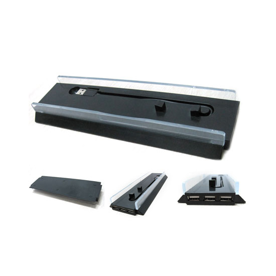 This streamlined and elegant stand is designed for holding your PS4 console firmly. It comes with a skid-proof design on the bottom. This PS4 console stand has blue LED lights and USB extension ports.