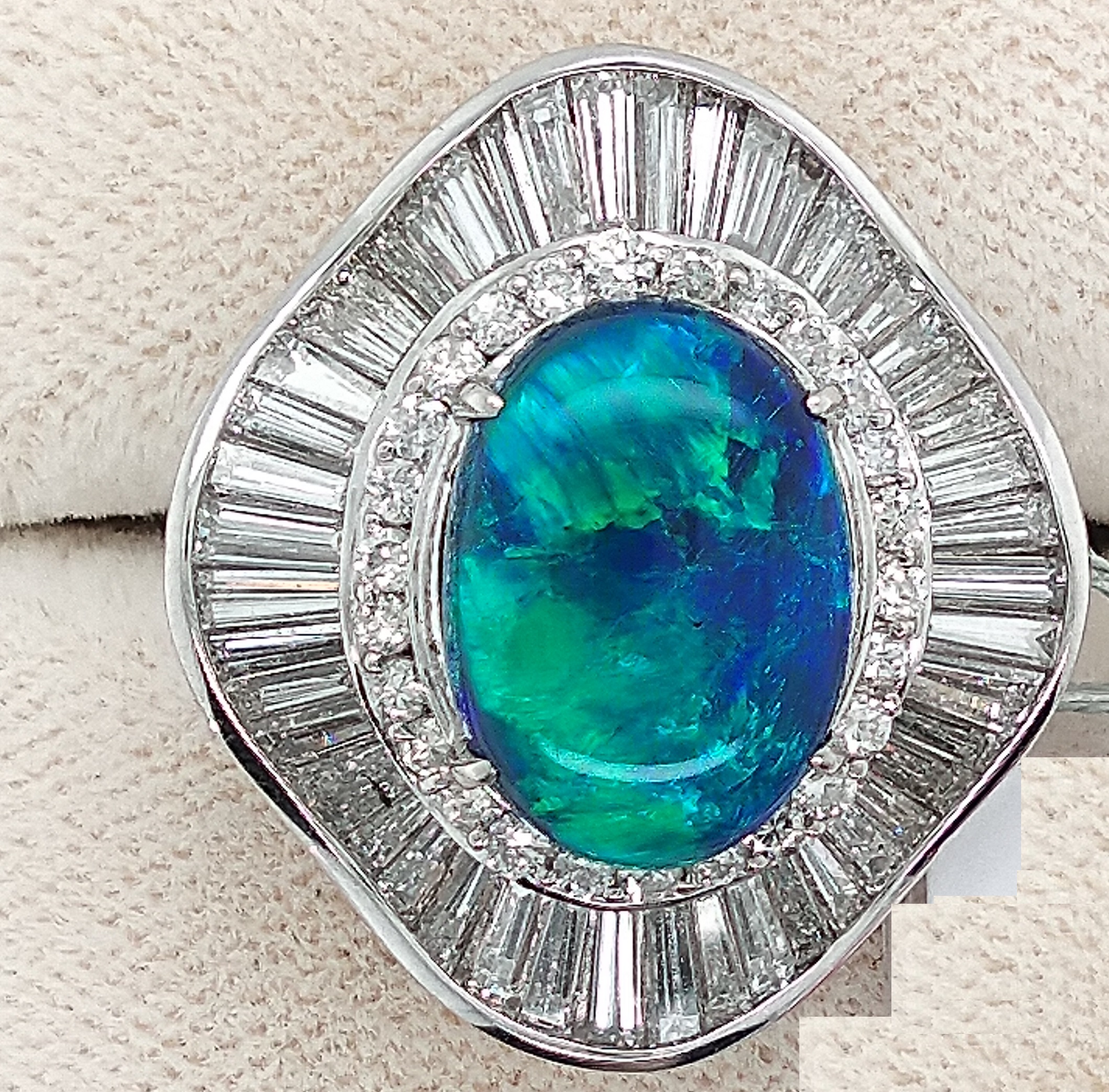 It is a PT Black Opal Ring with 6 carat center stone , 3.05 carat side stones & total weight of ring is 20.10 grams.