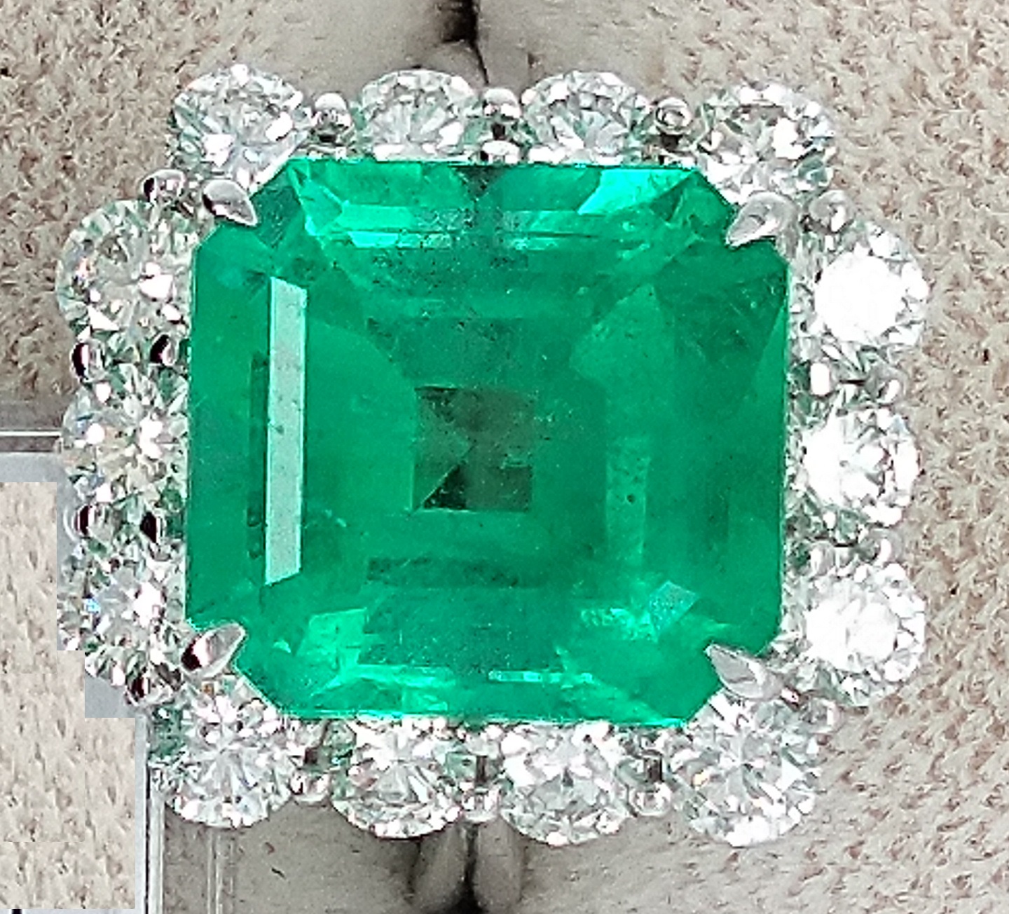 It is PT Emerald Ring . Center stone is 6.41 carat , side stones are 1.62 carats. Total weight of the ring is 7.76 grams.