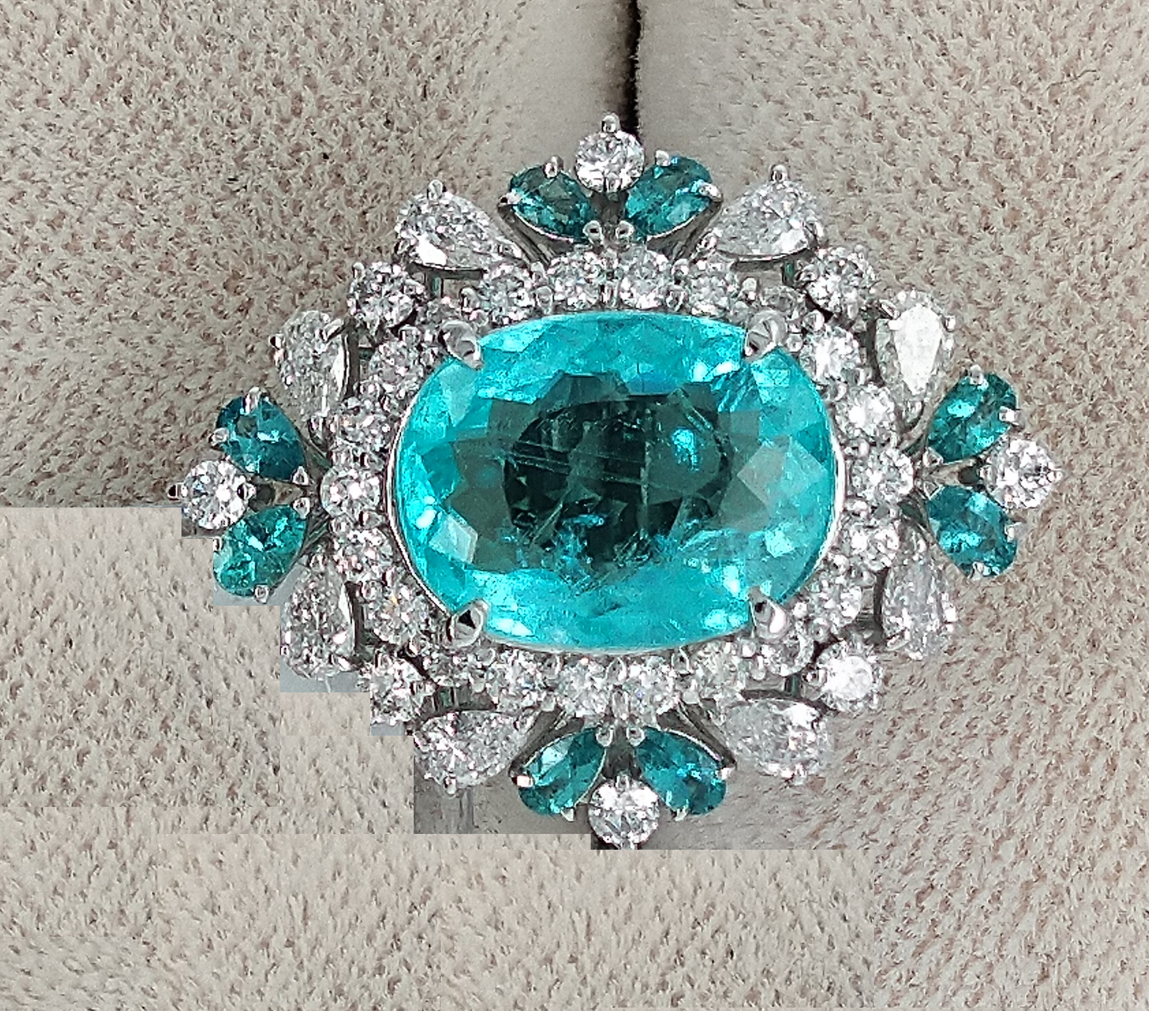 It is PT Paraiba Ring with 4.85 center stone , side stone paraiba 0.38 carat & diamond 1.31 carat. Total weight of the ring is 11.27 grams.