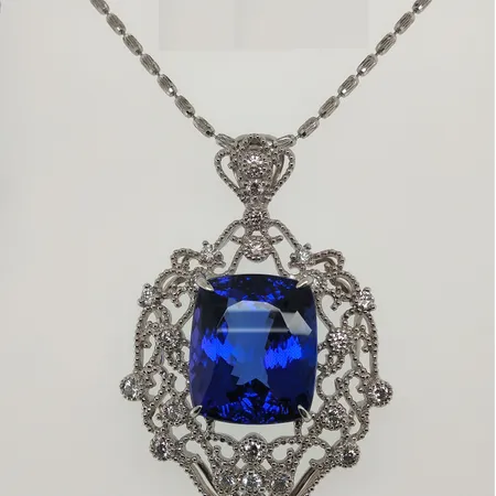 It is PT Tanzanite Pendant. Total carat of stone is 44.23 carats , side stones are 2.04 carats. Total weight of the piece is 48.63 grams.
