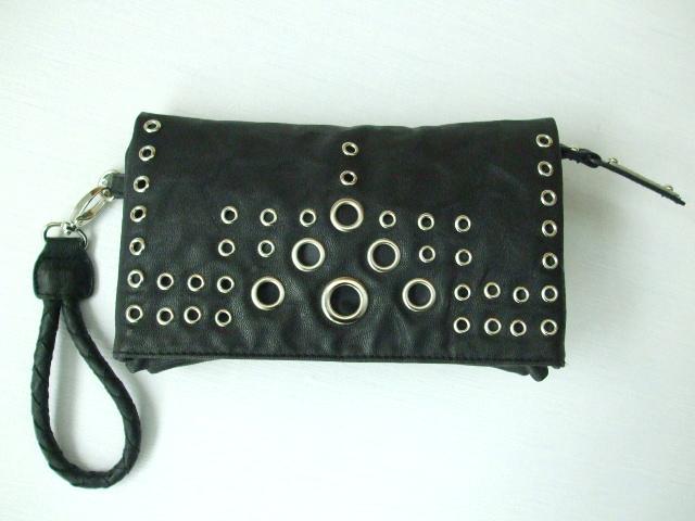 The PU clutch bag boasts a black-colored base that is topped with catchy silvery rings. It comes with a flap closure with the zipper to secure your belongings without delay. The robust woven strap further promises a firm grasp in the party.