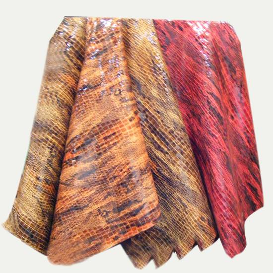 These are samples of glossy PU faux leather material. The synthetic leather features a color changing capability under heat pressing. Real leather patterns of different animals are available.