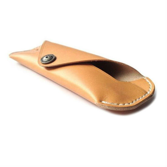 Highlighted here is a glasses pouch made of PU leather. It has a snap button flap closure with a button adorned with elegant patterns. This pouch comes in a compact rectangular shape and is excellent for carrying glasses around.