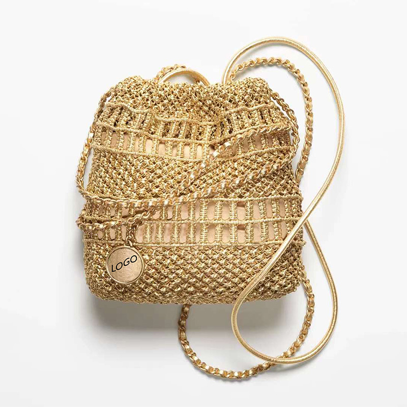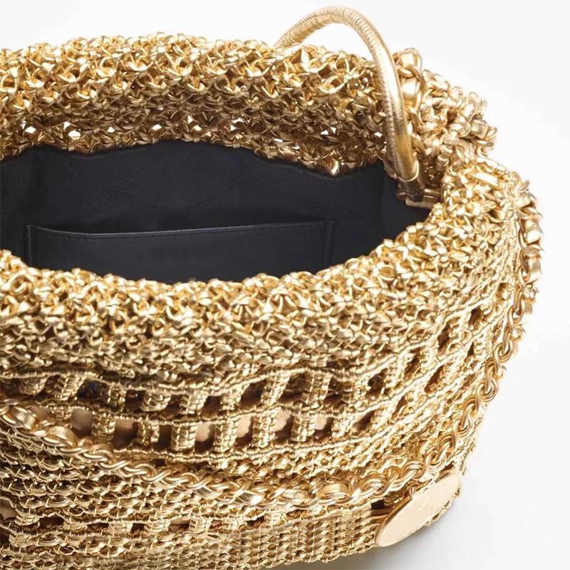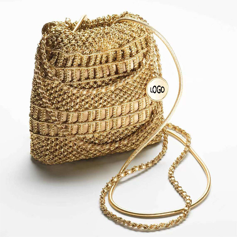 This luxury PU woven handbag combines style and functionality, featuring a classic bucket design with a golden finish.