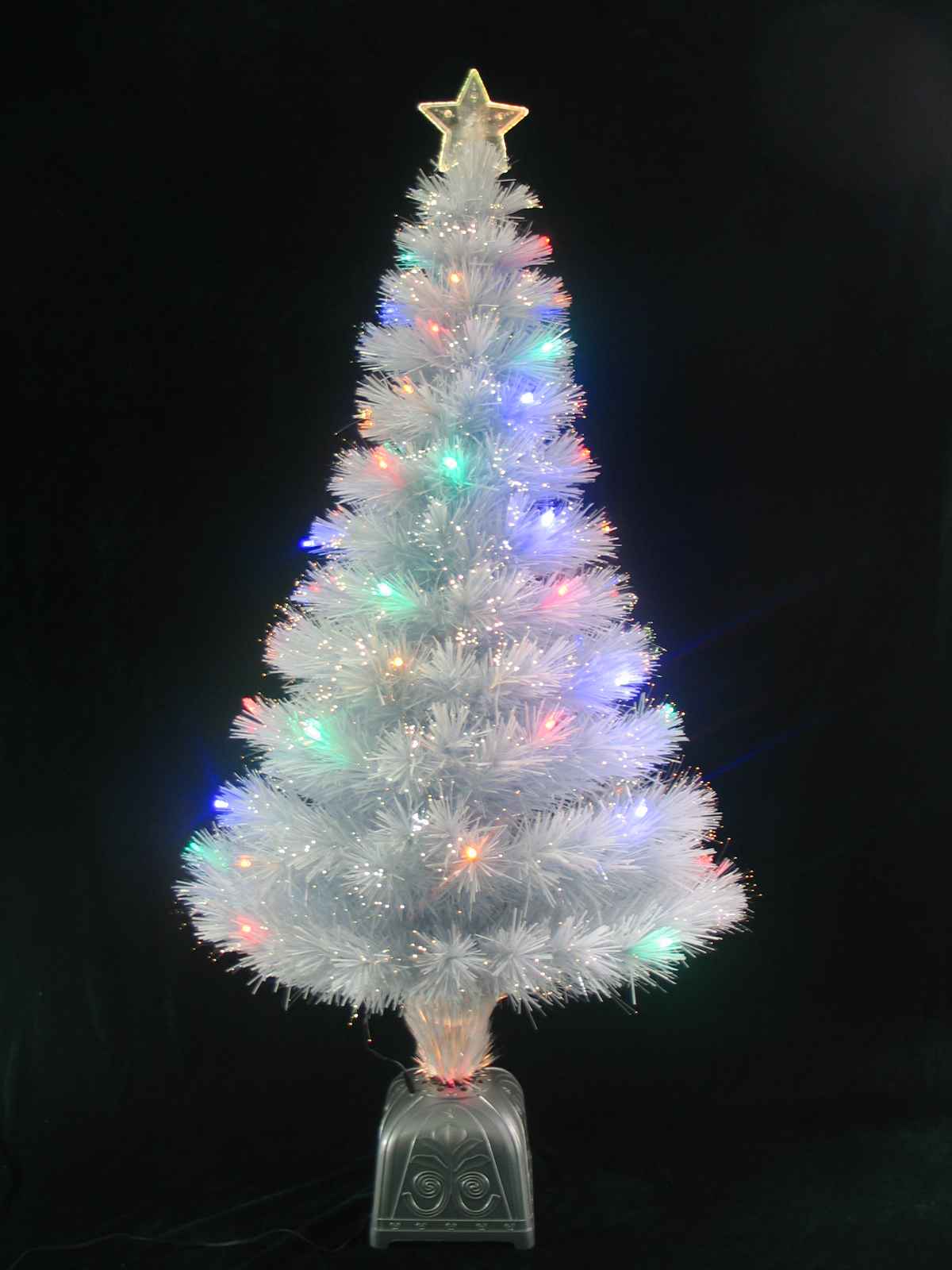 This is a PVC Christmas tree light accenting 50 LED lights on its body. It features a transparent star on the top, showing the chromatic LED colors. The white optic fiber goes well with the silvery embossed base, giving you the mood of snowy Christmas.