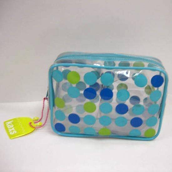The delicately designed cosmetic bag features a transparent rectangular-shaped body with dotted patterns in different colors. The bag comes with top zip-around closure that enables you access to the essential items easily.
