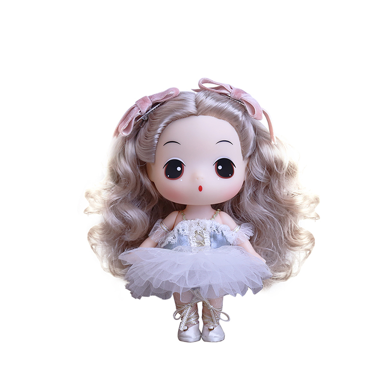 This PVC doll features lustrous golden curls that cascade softly, adding a touch of glamour and sophistication. Her look is perfectly accented by two pink velvet bow hair clips, lending a sweet and delicate touch to her ensemble. Dressed in a stunning ballet dress and matching ballet shoes, this PVC doll is a perfect gift for both little girls and doll collectors.