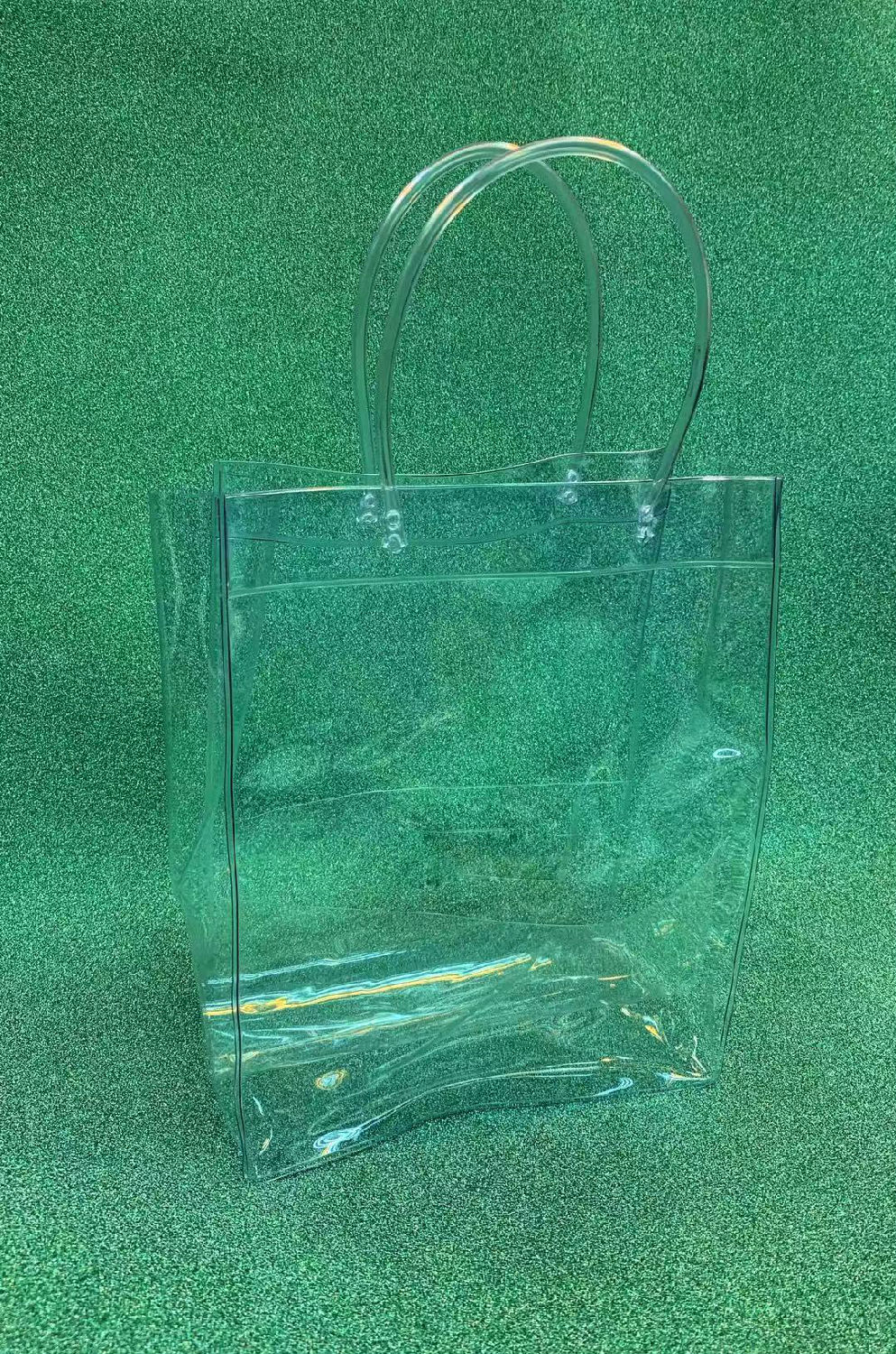 The displayed handbag is made of PVC and has a gusseted body in rectangular shape. It has two tube handles for comfortable carrying and flaunts a durable and lightweight construction. This PVC handbag has a clear body to offer a good view of stored contents and is excellent for packaging and storage use.