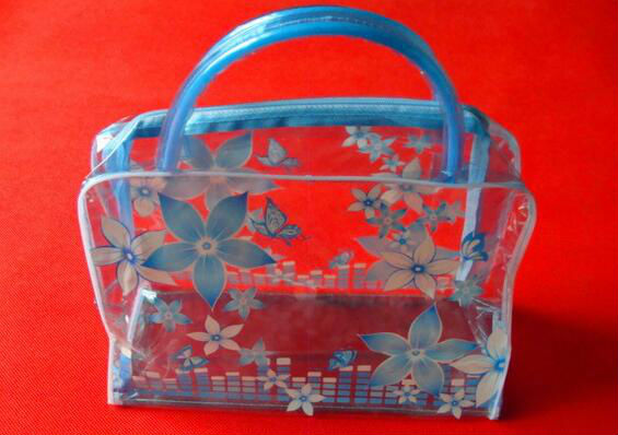 PVC wash gargle bag is made of PVC material and handle with silk printing logo