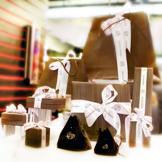 As shown are luxurious packaging boxes and bags for jewellery products. All of them are made in Italy. There is an incredibly wide selection of colours, sizes, materials and printing for the bags and boxes.