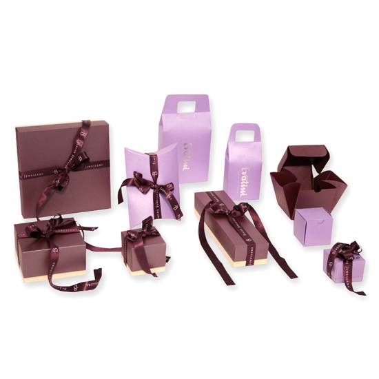 As shown are luxurious packaging boxes and bags for jewellery products. All of them are made in Italy. There is an incredibly wide selection of colours, sizes, materials and printing for the bags and boxes.