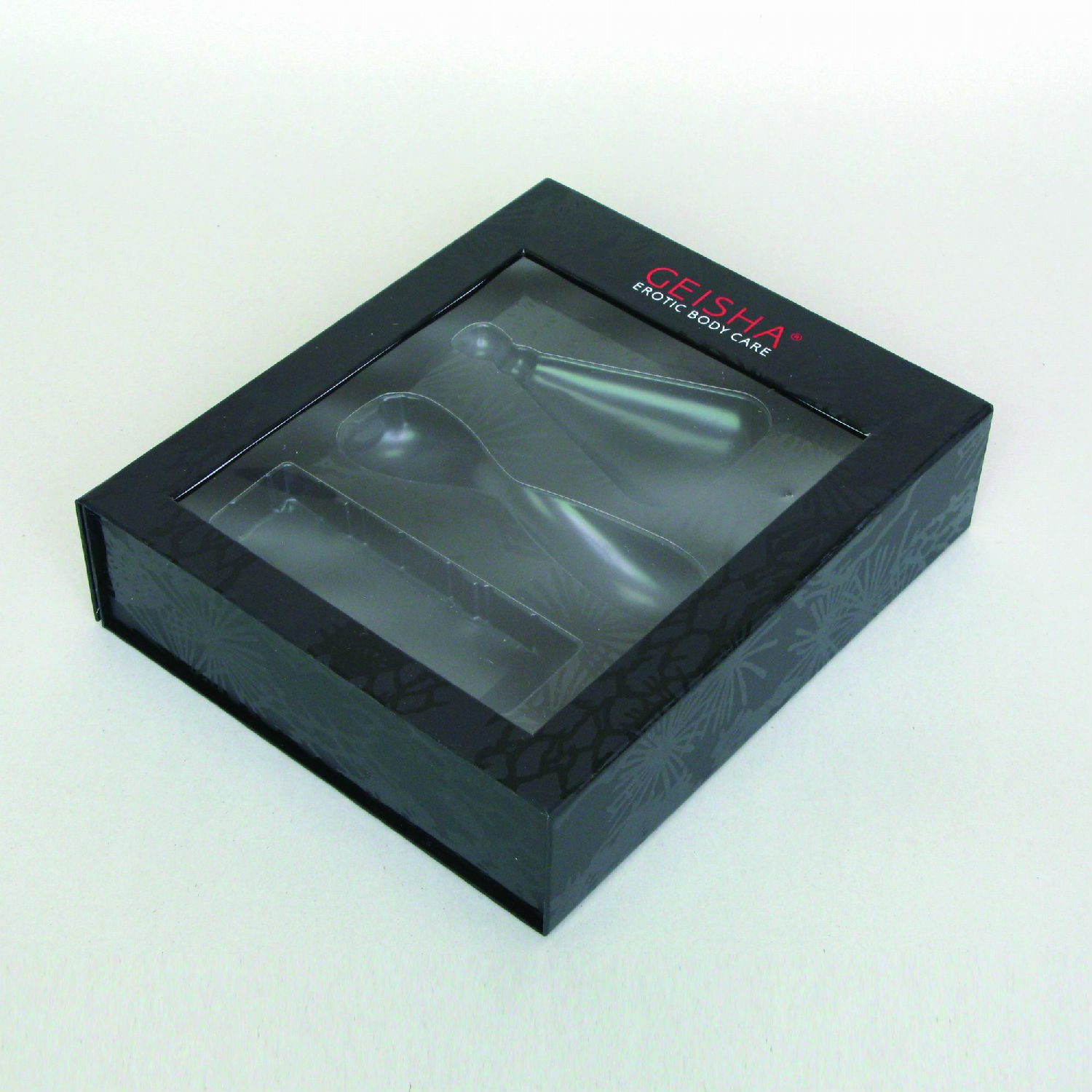 Paper boxes with PVC window to show the products, and matt lamination with spot UV finishing.
