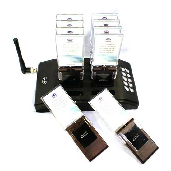 Featured is a paging system coming with shiny cranberry plating. The system features wireless pager programmability to fit different needs. The unique base ID of each machine helps eliminate overlapping messages with other restaurants.
