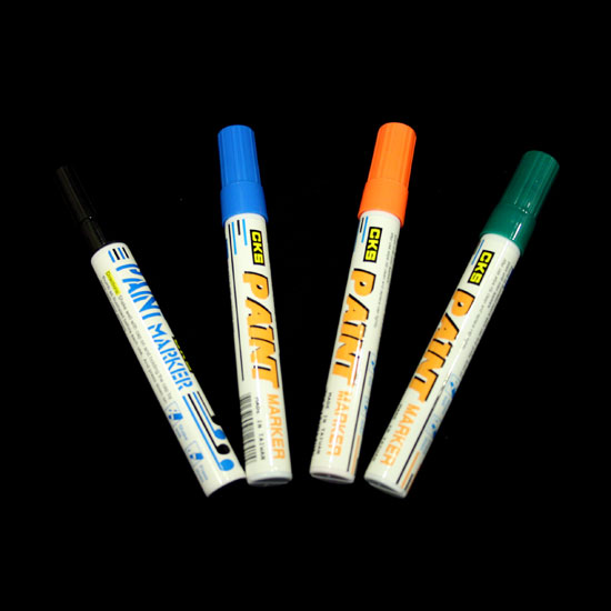 Pictured are 4 excellent paint markers of assorted colors. The marker is filled with opaque permanent ink and for use on plastic, metal, canvas, and painted surfaces. The markers can produce vibrant and fade-proof colors.