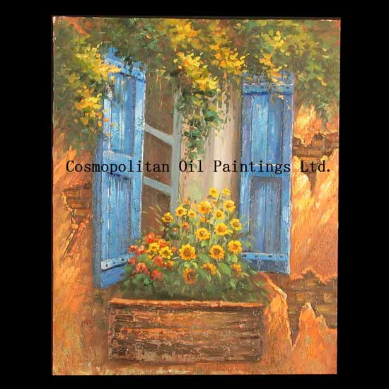 This oil painting features a pair of blue open windows on an orange wall. Blooming sunflowers outside the window make the viewer feel cheerful and energetic. This balanced painting is a delightful addition to your home or restaurant.