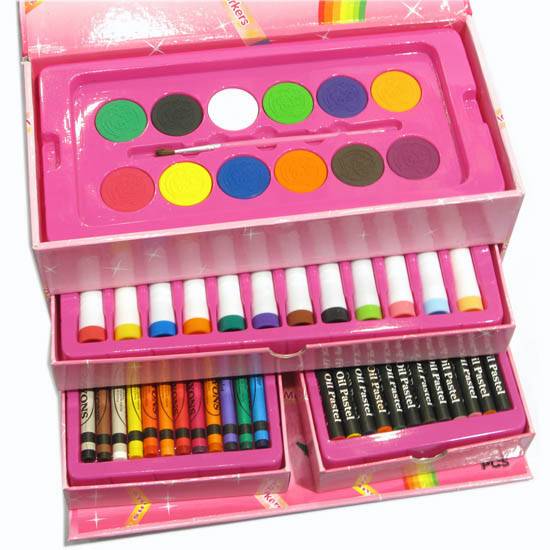 This painting tool set is a great choice to stimulate children's creativity. The hard patterned shelf provides 4 different types of paint including watercolor, coloring pens, crayons and oil pastels. The great varieties of color let children try out different styles of art at a time.