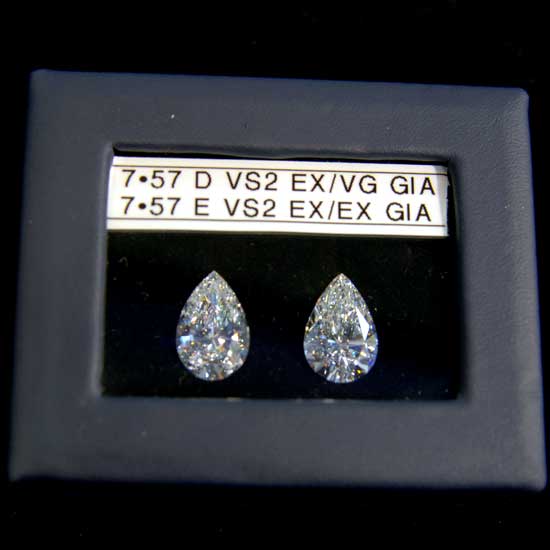 Showcased is a pair of diamonds with the exquisite pear-shaped cut. The diamonds perfectly reflects with dazzling sparkles, making them the ideal piece to perfect your jewelry designs. This elegant pair has been certified by the GIA for promised quality.