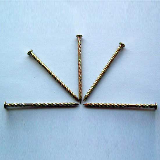 As shown are pallet nails which are constructed of durable material. They come with trim and long shanks bearing slant threads. These pieces are designed to promise secure and lasting adhesion.