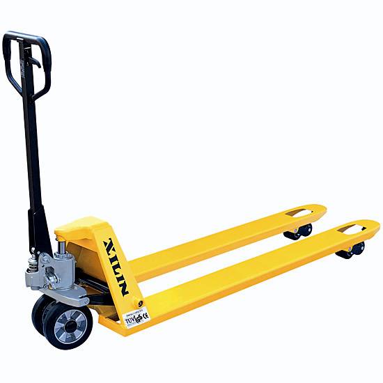 This pallet truck features a heavy-gauge steel channel frame with reinforced tapered steel forks, which are designed for smooth pallet entry and exit. The premium hydraulic pump with a spring-loaded, loop handle has a 3-position fingertip control for fast lifting and efficient moving.