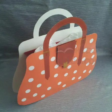 The paper bag features a fashion handbag design. It is made out of 350g white card paper. The bag also exhibits a nice dotted design.