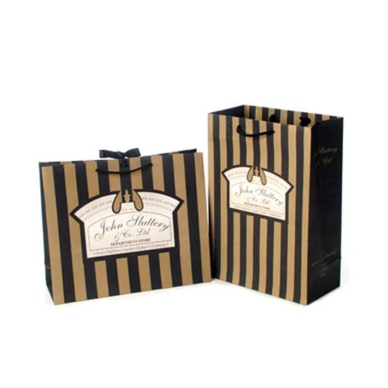 This paper bag comes in a rectangular shape with a black and beige striped pattern. The front is designed with lovely graphics in black and white for extra style. The beautiful shopping bag is finished with a pair of black ropes for carrying.