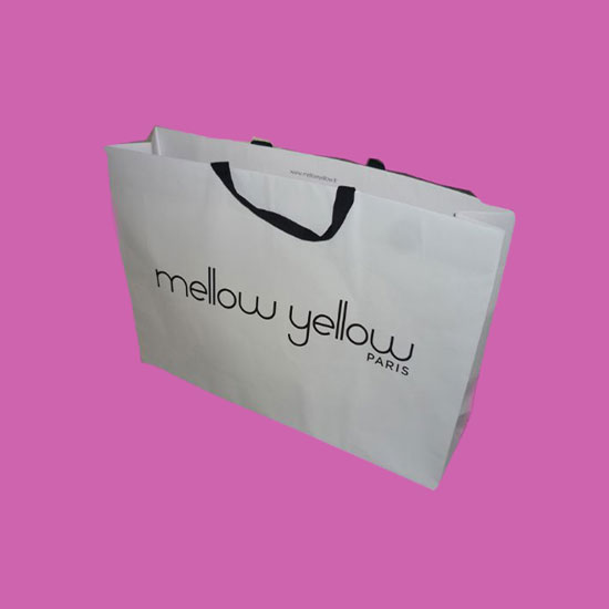 This is a paper bag with a rectangular body and sturdy handles. It is printed with black words in white. This bag is made of high-quality material for high robustness.