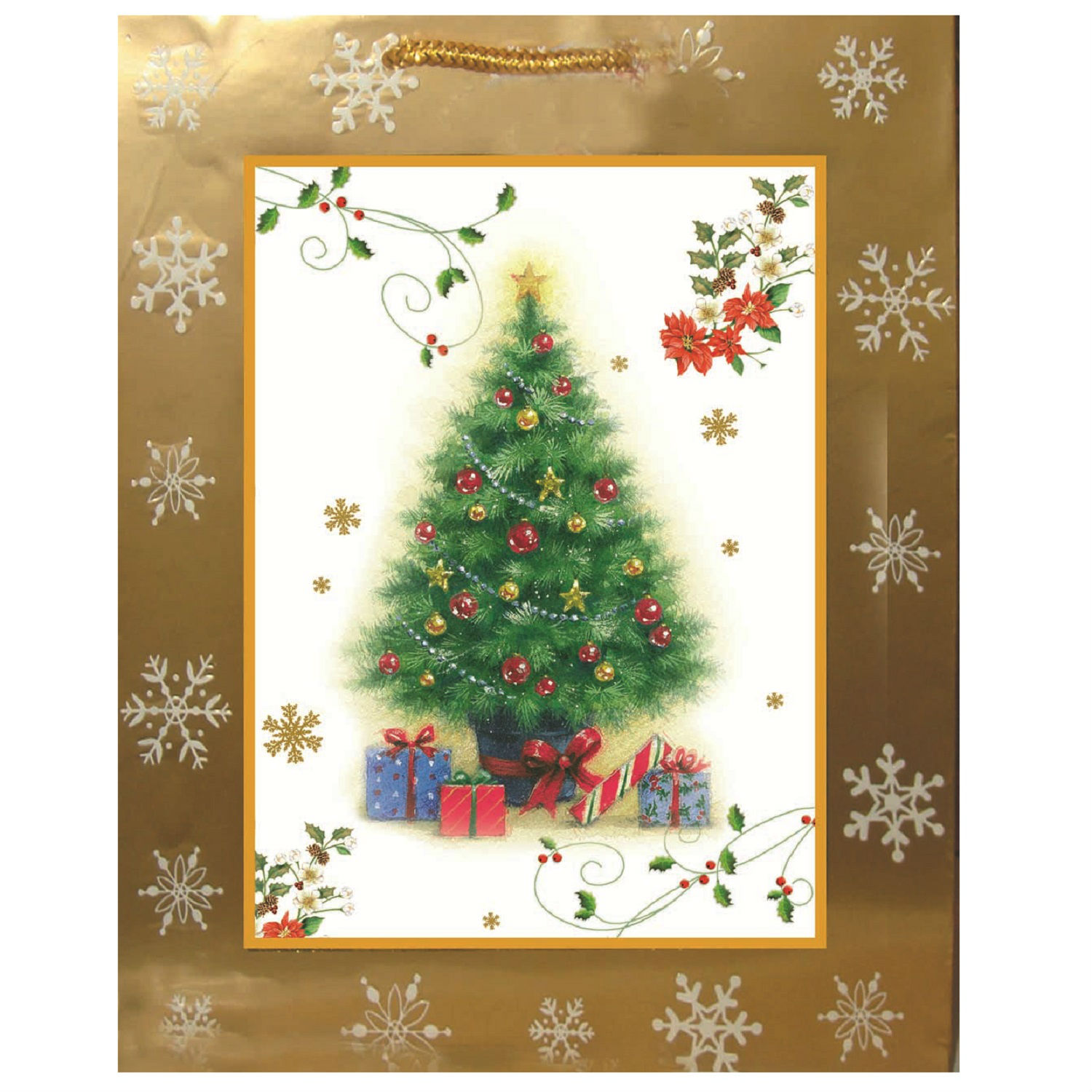 • Each of these light brown toned paper present bags is adorned with festive green, ornament laden, Xmas trees.