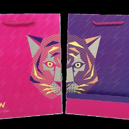 Two types of gift bags, in rose pink and deep purple, feature the trendy tiger pattern that resembles flames and light. The geometric texture enhances the blend of wildness and fashion. They are eye-catching artworks for gift-giving occasions.