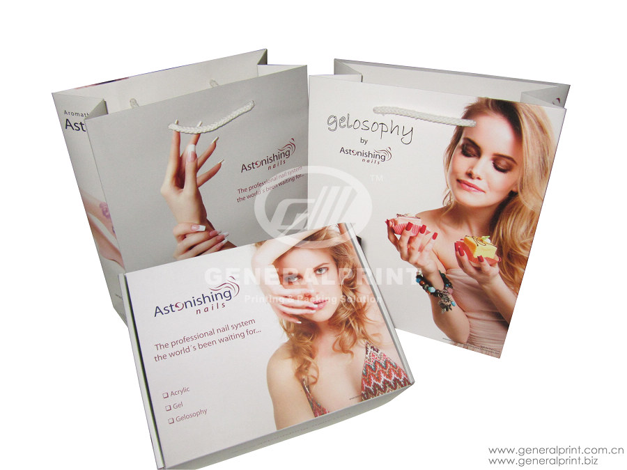 Materials: --Printable art paper of different thickness and weight, brown or bleached white Kraft paper: White/brown Kraft paper: 150gsm and so on Art paper: 170gsm, 190gsm, 210gsm, 250gsm, 300gsm And other special paper mounted chipboard 4) Finishing: --gloss lamination, matte lamination--high gloss UV varnish, UV coating, aqueous coating--UV glittering, silk screen glitter powder printing--frosting, embossing textures and patterns--gloss and matte wrinkle vanish--anti-counterfeiting finishes--various colors flocking--gold/silver or other colors foil hot stamping--logo embossing or debussing 5) Packing: as per customer's request, each carton max in 15kgs, palletized is also available.