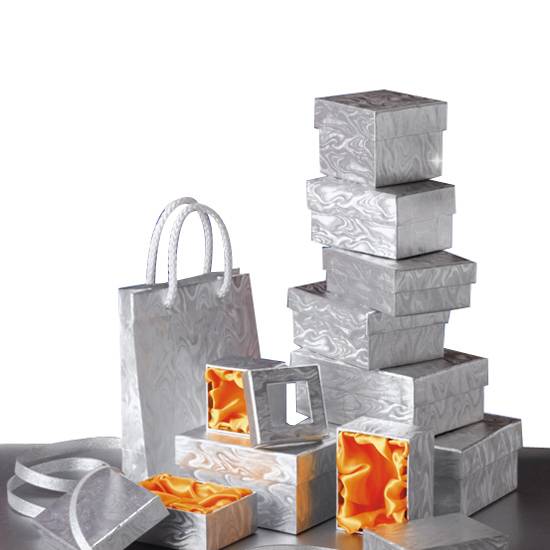 These are different types of paper bags and paper boxes. All of them are well printed with silver patterns and the boxes can be designed with golden foils. Moreover, The boxes can be decorated with a clear window on the cover.