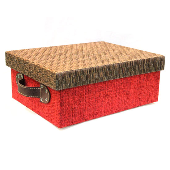 This paper box comes in a rectangular shape with a neat contour. It is covered with layers of the weaved cloth and gold wire for enhanced appeal. The side of it is riveted with a handle to ensure easy carriage.